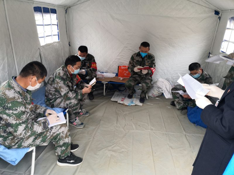 为加强整个回龙寺社区辖区的防控,在退役军人突击队的基础上,成立了回龙寺社区防控工作队第一临时党支部。董明伟、贾斌、葛元生、牛新义、贺仁生、孙守成,都是临时党支部的成员,也都是退役军人党员,他们始终牢记党员军人的口号:“召必回,回必战,战必胜”。在防疫一线,他们各包一个片区,人均负责120户。40多天来,他们不知疲倦地为住户接送、代购各类生活用品,贾斌和董明武的鞋子都跑穿了底,但他们从未喊过一声累。