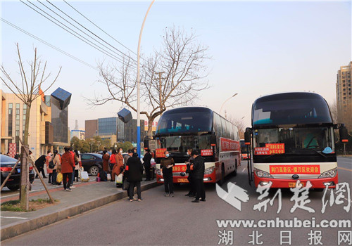 荆楚网客户端—荆楚网消息(通讯员 周芳、周宗国)3月14日,为确保市内乡镇的职工顺利返岗,荆门高新区·掇刀区多家企业租用大巴车,深入到钟祥、京山、沙洋的乡镇“点对点”接职工返岗。