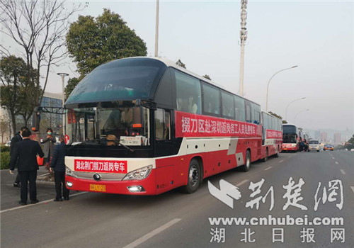 据悉,“点对点一站式”出省返岗免费专车将于19日晚到达深圳。返程时,将会带回荆门市掇刀区8家企事业单位的50余名员工,开启他们的回荆复工之旅。