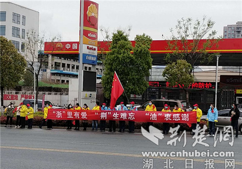 当日上午9点,中国石油湖北荆门销售分公司组织参加活动人员统一身穿加油站工装提前到场等候,与荆门市民一起夹道相送。看到医疗队车队开过来,参加送行活动的员工拉起横幅,挥动国旗,用呐喊口号表达感谢的心声。