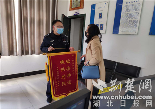 荆楚网客户端—荆楚网消息(通讯员 陈龙)“这面锦旗我送迟了。疫情期间,我跟你们一样,也坚守在工作岗位上,没有回过家,也没上过街,要不然这面锦旗我早就送来了!” 4月10日下午,钟祥市人民医院刘护士长将一面绣有“破案神速,执法为民”的锦旗送到莫愁湖派出所,感谢办案民警快速破案,帮她追回2900余元被盗现金。