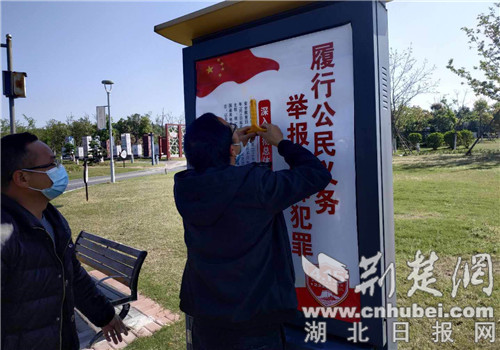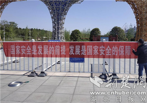 荆楚网客户端—荆楚网消息(通讯员 丰艳、徐薇)4月13日,在荆门市植物园,荆门市城市公园管理处的工作人员正在显眼位置悬挂“全民国家安全教育日”的宣传条幅,宣传电子屏等信息发布平台上也更换成相关的宣传知识。