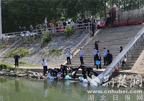 荆楚网客户端—荆楚网消息(通讯员 赵自云、阮进军)4月28日上午9时30分,在钟祥市汉江皇庄水文码头,28辆鱼苗罐车运送到达现场,随着钟祥市政府副市长王小庆一声“现在放流开始!”罐车阀门依次逐个打开,1420万尾鱼苗顺着两条放流槽欢快地游入汉江。