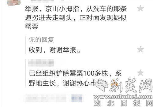 荆楚网客户端—荆楚网消息(通讯员 杨丽)5月5日下午,有群众在“京山公安”微信公众号上留言,举报京山一中对面小路上发现疑似罂粟,京山市公安局禁毒大队迅速指派温泉派出所组织核查铲除,并第一时间向举报人反馈致谢。