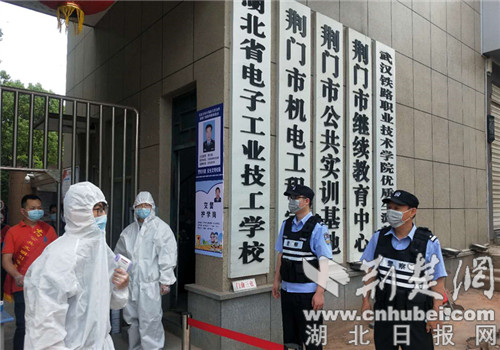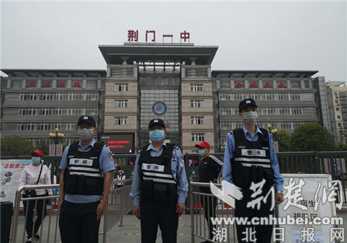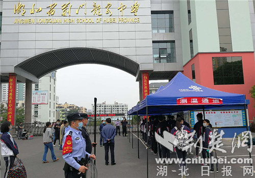 当日,泉口派出所社区民警带领辅警提前到岗,来回奔波于荆门市第一中学路口与校门口之间,耐心地引导着师生、家长,并配合校园保安做好登记、体温检测等工作,指引学生按要求进行入校检查。