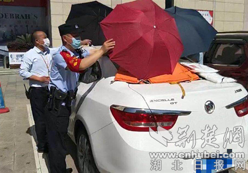 民警借来雨伞降低车内温度升高的速度。通讯员供图