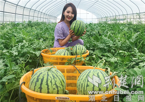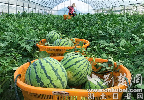 荆楚网客户端—荆楚网消息(记者 安从斌 通讯员 叶玉兵、刘帆)5月14日下午,记者来到双井村西瓜种植基地,在一处设施大棚前,前来买瓜的市民络绎不绝。