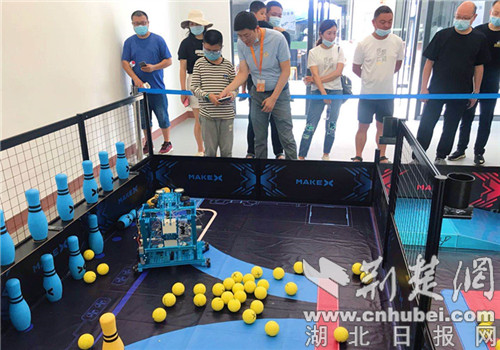 孩子们现场操作机器人打保龄球。记者安从斌摄