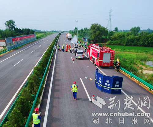 16时03分,荆门市公安局交通警察支队高速大队接到现场驾乘人员报警,监控室立即向上级进行汇报,并通知辖区各相关单位,迅速启动高速公路应急处置预案。辖区的各高速收费站接到指令后立即将通往枣阳的高速公路入口封闭,并做好解释工作。交警、消防、公路养护、医疗急救、清障救援等单位的11辆救援车辆。40余名救援人员火速赶赴事故现场,根据各职责迅速开展救援。