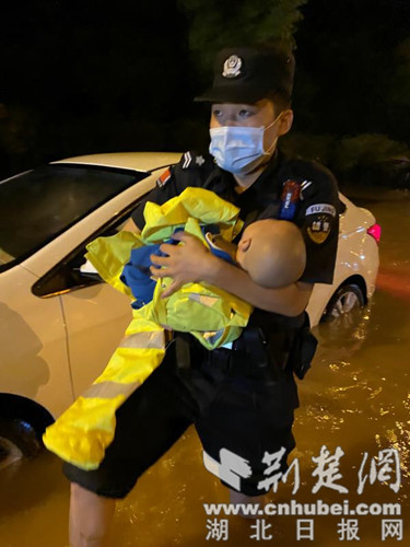 27日20时45分接指挥中心指令,泉口路万华城附近,报警人许磊称车被困在水中,车中有老人和7个月的大婴儿,寻求警察帮助报警。巡特警支队苏畈桥警务站民辅警迅速赶到现场。因路面涉水太深,车辆进不去,民警带领辅警徒步涉水至车辆被困地点后,先将婴儿抱出带至警车看护,后继续帮助许磊一家从水中脱困。