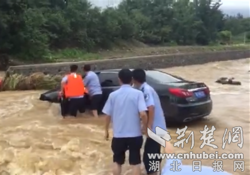 6月28日中午12时35分,省道S327坪客线三阳桥附近,一辆小车被洪水冲入肖家河里。三阳派出所所6名民辅警迅速出动,将被洪水围困的2名乘客成功救出。
