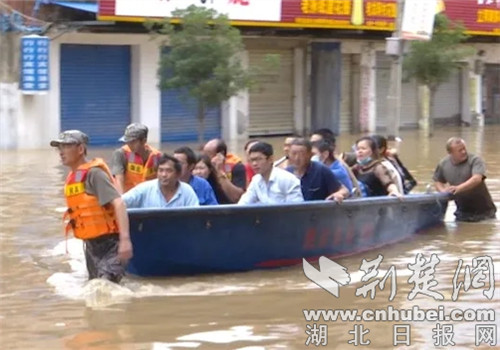 钟祥市双河镇20小时内降雨量达301毫米,双河街道被淹没近2公里,最深处达2.5米,370余户近千名群众被困,800多间门店被淹,是钟祥市受灾最为严重的乡镇。