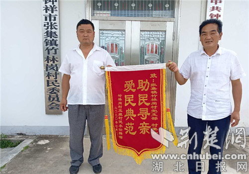 荆楚网客户端—荆楚网消息(通讯员 赵自云)7月6日上午,钟祥市张集镇竹林岗村村民李仕群将一面写有“助民寻亲、爱民典范”的锦旗,送到村党支部书记宁德志等村干部手中,以表达对村干部、驻村扶贫工作队和乡亲们为他寻找到失踪三天三夜的母亲的感激之情。