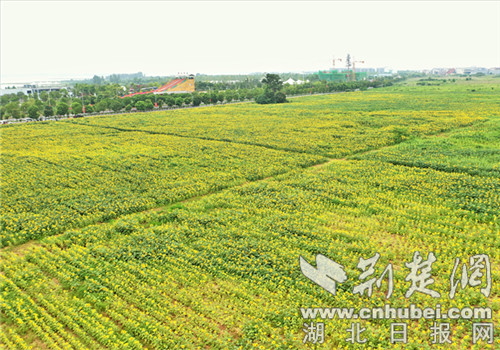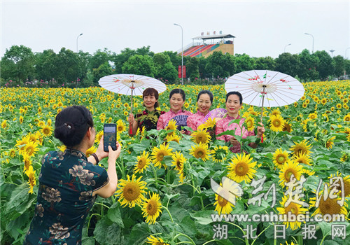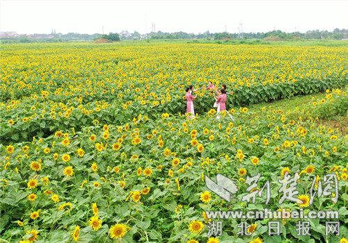 荆楚网客户端—荆楚网消息(记者安从斌 通讯员叶玉兵、王沁)7月16日,在荆门爱飞客航空小镇极客公园游客接待中心西侧,一望无际的向日葵花田里,一朵朵金黄色的花盘就像一张张笑脸般迎着太阳肆意绽放,沉静而壮观的花海,构成了一道金灿灿的景观。