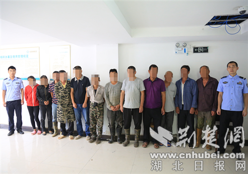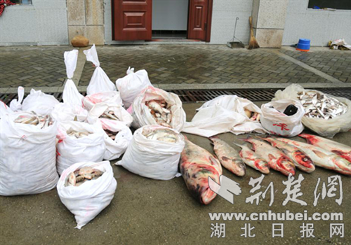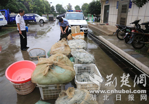 7月20日晚,沙洋县公安局调集辖区8个派出所以及治安、巡警等80余名警力展开收网抓捕行动,3名鱼贩子及其车辆被民警堵截在村道上,11名刚刚上岸的非法捕捞人员在整理渔获时被抓获,警方累计查获非法捕捞的毛花鱼、鲌鱼、鲢鱼800余斤,收缴网具40余副,网具总长度超过4000米。经渔政部门鉴定,被警方收缴的网具中,大部分是禁用的小孔径刺网,对渔业资源有破坏性的影响。