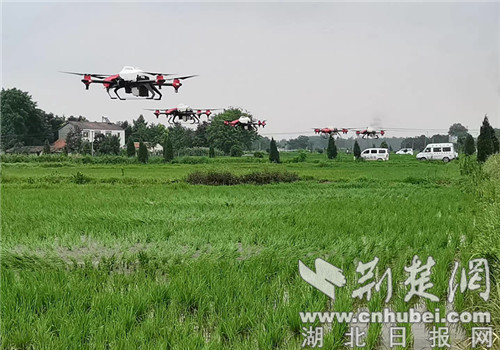 荆楚网客户端—荆楚网消息(通讯员 刘洋、曹勇)8月5日,在荆门市东宝区仙居乡新坪村的水稻田里,数台无人机正在喷洒农药,进行稻田病虫防治。
