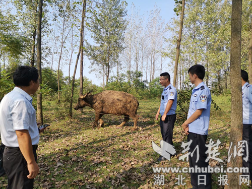 曾集派出所民警接到报警后立刻行动,通过辖区各村的综治工作群征集耕牛走失的线索,与此同时,四名民辅警驱车前往耕牛走失地附近展开地毯式搜索,最终历时4小时在一树林将耕牛寻回。