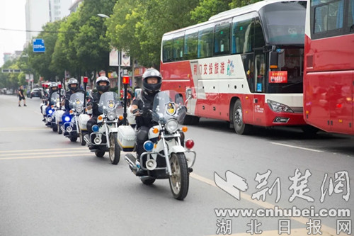 荆楚网客户端—荆楚网消息(通讯员 贺林辉)8月28日,在荆门城区象山大道上,数名背着“大宝剑”的巡特警骑着警用摩托车威武帅气的驶过,引得众多市民拿出手机拍照,直呼好帅。