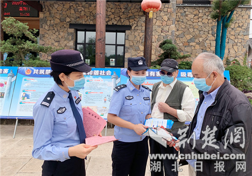“宣传之花景区开,健康生活好再来。来到钟祥旅游,不仅体验了长寿之乡的风土人情,欣赏了莫愁女的多姿,还学到了防电诈、禁毒知识,真值!”一名在钟祥莫愁村景区游玩的游客对正在进行防电诈、禁毒宣传的民警连声称赞道。