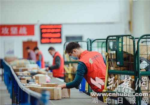 荆门邮政工作人员正在分拣快递包裹。(通讯员供图)