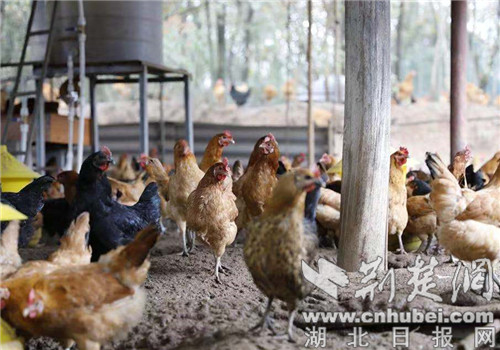 胡家嘴生态农业公司大力推行“金鸡模式”,即农户提供场地代养、企业全程技术指导和统一销售、双方按比分红,为贫困户配出增收脱贫“金钥匙”。子陵铺镇青山村二组的贫困户王士良便是“金鸡模式”的受益者,他利用自家闲置的猪圈代养1000只土鸡,1只土鸡加鸡蛋产生的平均收益115元,扣除成本75元后,公司与农户五五分成,加上10元的奖补资金,农户纯收益近30元。期间疫病损失由胡家族公司全部承担,按照80%的存活率,王士良的收入近2万元。