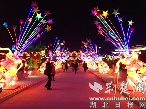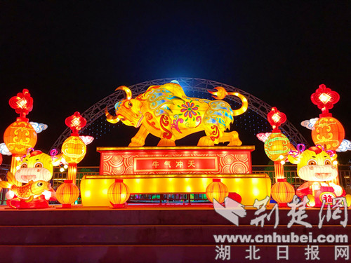 荆楚网(湖北日报网)讯(记者安从斌 通讯员 熊东东 刘成化)2月21日,恰逢周日,位于荆门市漳河新区却集村的湖北群艺生态休闲农业园内,近千盏造型各异的花灯将园区装扮一新。垂钓、VR过山车、淘气堡、喊泉等游乐项目,为“就地过年”的市民营造出一个欢乐祥和的节日游园好去处。