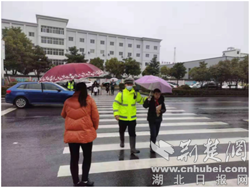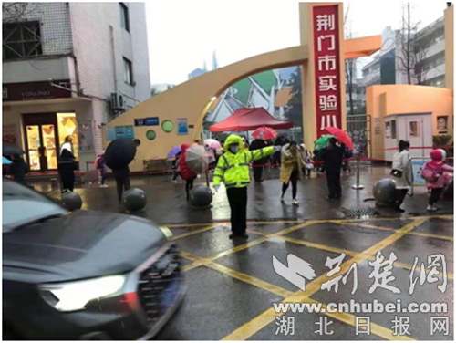 荆楚网(湖北日报网)讯(通讯员 谈媛媛)2月28日,是荆门市2021春季开学第一天。连日来的阴雨天气不仅给学生和家长出行带来很大不便,也给交警的护学工作带来极大考验,为此,荆门交警多措并举深化新学期护学工作,努力为孩子们上学营造良好的交通环境。