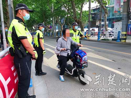 查处电动自行车违法载人。记者安从斌 摄