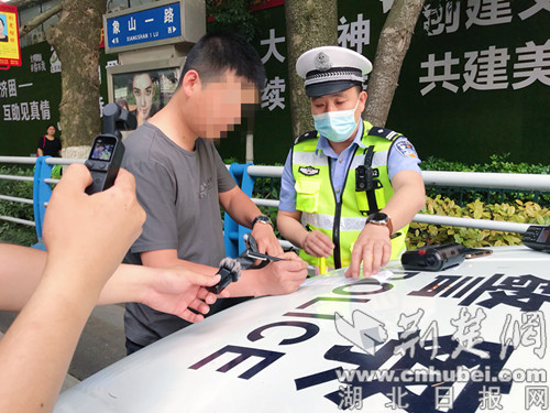 违法闯红灯接受交警处罚。记者安从斌 摄