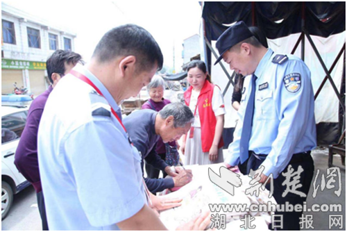 5月12日,东宝区仙居乡的集市路口,荆门市公安局东宝分局仙居派出所民警和志愿者们“摆摊设点”,开展反电诈知识宣传。活动现场,民警一方面宣传下载反诈APP,一方面提醒没有智能机的老人碰到类似的电话提高警惕,当心被骗。