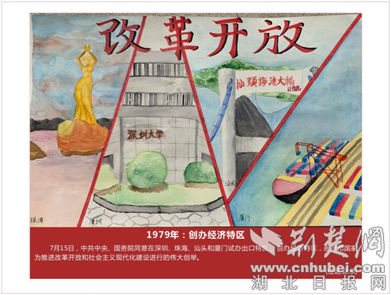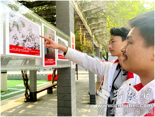 长廊上展示的100幅绘画作品,是由荆门一中100名师生共同创作的。3月底,该校先组织部分历史老师梳理,确定了中国共产党百年历史中具有重大意义的事件,并于清明节期间,安排13位美术老师和87名美术专业的学生完成绘画。4月20日,作品在校园里的一处长廊上展示出来,供师生们学习观赏。自那天起,每到课余时间,这里就成学生最为集中的地方,有的人忙着做笔记,有的则聚在一起讨论。