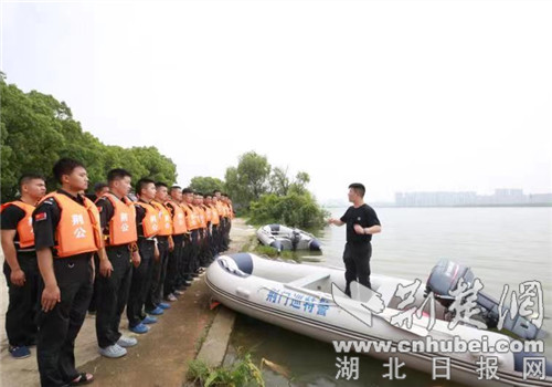 荆楚网(湖北日报网)讯(通讯员 贺林辉)6月2日,荆门市公安局巡特警支队组织处突、防暴大队民辅警,在凤凰湖水库进行冲锋舟操作集训暨水上救援训练,备战夏季汛期。训练将持续一周的时间。