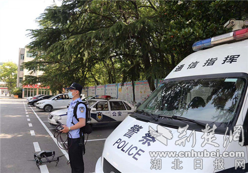 在沙洋县后港中学考点,一架警用无人机从通信指挥车上起飞,画面通过无线图传系统实时传回到指挥大厅,为指挥员调整警力部署、应急决策提供一双“鹰眼。沙洋县公安局指挥中心教导员刘金强表示,他们应用多种科技手段提升通信指挥效能,为考场提供立体化的安全环境。