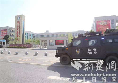 在沙洋县汉上实验小学考点门前,巡警大队街头快反小组驾驶装甲巡逻车进行驻守,小组成员携带应急处突装备在考点外围不时穿梭。巡警大队大队长李永学介绍,他们将街头警务站、快反巡逻车重新编组,增加考点巡逻频次。