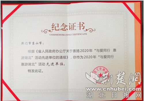 荆楚网(湖北日报网)讯(通讯员 陈剑敏 王敏)6月6日下午,2021年湖北省A级旅游景区人气提升行动启动仪式在武汉举行。活动现场通报了2020年“与爱同行 惠游湖北”活动受表彰单位,京山市被评为先进县(市),成为全省14个获奖的县市区之一。京山市绿林山景区被评为优质服务景区。
