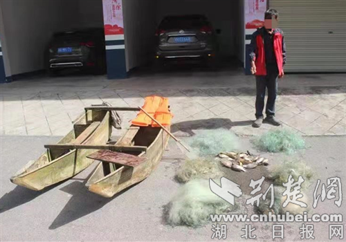 6月4日凌晨3时许,却某(男,68岁,荆门市漳河镇人)趁深夜四处无人,抱着侥幸心理,利用准备的挑船和刺网布置“十面埋伏大阵”在该水域内进行非法捕捞水产品。而此时,漳河水陆派出所联合渔政部门正在漳河水域巡查,将正在使用挑船和刺网在该水域内进行非法捕捞的却某当场抓获。民警现场扣押六张约50米长度的刺网、一艘挑船以及非法捕捞的水产品7.43公斤。