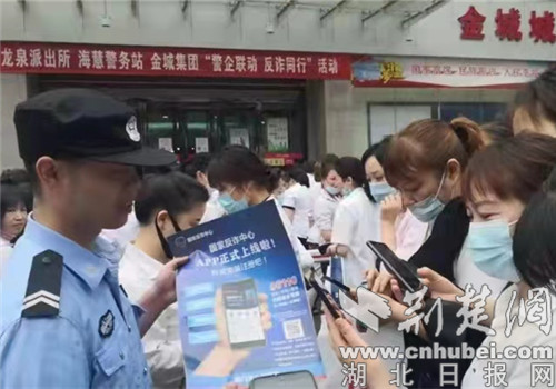 荆楚网(湖北日报网)讯(通讯员 王妙)为防止企业职工遭受电信网络诈骗,切实守住群众钱袋子,荆门市公安局东宝分局龙泉派出所积极探索警企合作新模式。6月10日上午,该所与海慧警务站联手走进金城集团开展了"警企联动,反诈同行"活动,开启反诈宣传新攻势。