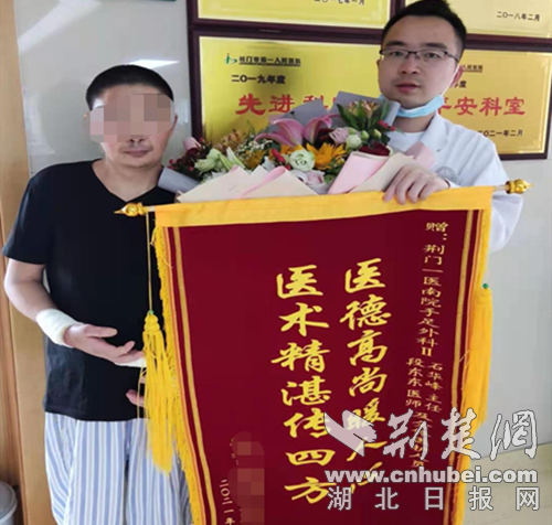 经过了三个多星期,医生为患者进行了带蒂皮瓣断蒂术。皮瓣血运良好,大川的双手一天天好起来,美起来。大川对双手的外观修复很满意,连连称赞:“一医的医生护士真是太专业了,我的手能恢复的这么好真的要感谢你们!”三个月的治疗,三个月的精心护理,大川出院了。不善言辞的一家人,送来了一面锦旗,表达了对医护人员的感激。