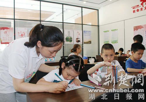 图为小朋友在志愿者的指导下绘画。通讯员供图