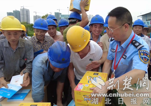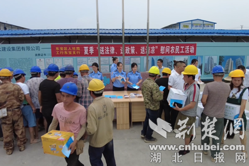 荆楚网(湖北日报网)讯(通讯员 宁洁)7月16号上午,荆门市东宝区人社局联合工商银行东宝支行在辖区项目工地联合开展2021年夏季“送法律、送政策、送清凉”活动。