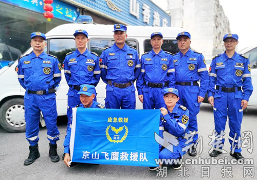 图为京山飞鹰救援队集结准备出发。通讯员供图