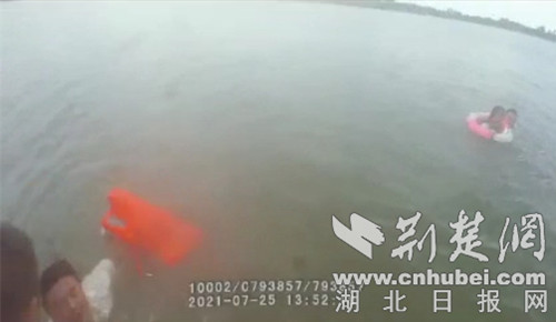 “快,人在那边。”当民警田庆刚赶至碧桂园路附近,看到凤凰湖离岸不远处的陈光辉抱着一名年轻女子正在水里挣扎。田庆和辅警吴正晗迅速带上救生圈和救生衣跑向两人方向。