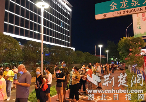 荆楚网(湖北日报网)讯(记者 安从斌)8月5日凌晨1点,位于荆门市东宝区龙泉街办金龙泉社区的核酸检测集中采样点,众多市民通宵排队等待核酸检测。
