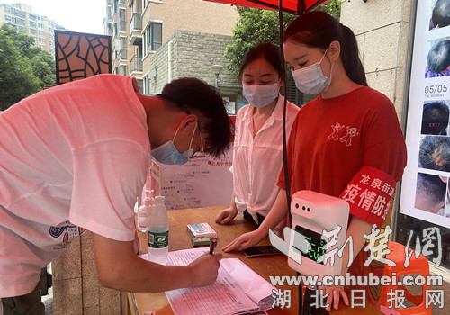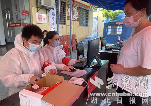 荆楚网(湖北日报网)讯(通讯员 彭迎兵 李姗姗)8月6日,烈日炎炎,荆门市东宝区龙泉街道千佛洞社区青年路上,等待核酸检测的居民有序排成长队。社区志愿者罗陈晨套着厚厚的防护服戴着口罩,来不及擦一下额头的汗水,眼睛快速扫过电脑屏幕上的数字,认真登记核对录入居民身份信息和联系方式。她的身旁,男友徐文涛正在识别身份证信息,妈妈卢春丽正在引导已完成登记的居民进行核酸采样……
