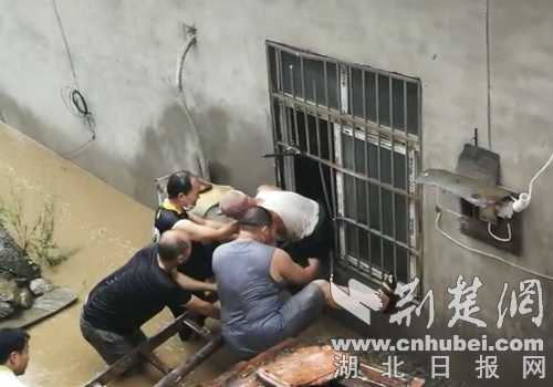张集社区干部杨勇和余江华在巡查中发现,张集中学食堂后面还住着一位老人,此时积水已淹至胸口,无法从大门进入,为了救人杨勇砸开食堂窗户防盗网,翻窗进入屋内,将被困老人成功救出。