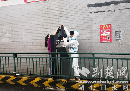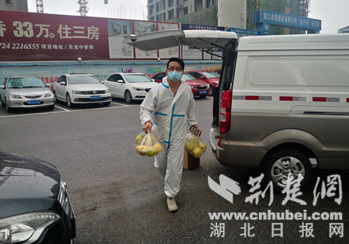 荆楚网(湖北日报网)讯(通讯员 高先勇)8月16日上午10点半,位于荆门市掇刀区白庙街道明月里社区的金色华府小区门前,隔着小区门的道闸,郭荣能正将香瓜和土鸡递到小区居民杨琼手上。