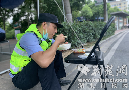 8月7日中午,民警宋林刚、辅警黄守斌核查了一上午的车辆信息,趁着车流量减少,席地而坐匆匆吃饭,忙碌了半天,消耗了不少体力,此刻的他们吃嘛嘛香。