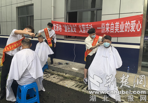 8月23日上午,来自发源地理发店和大红鹰医疗美容店的5名爱心志愿者在荆门市公安局东宝分局龙泉派出所开展了“爱在发尖”义剪活动,为战疫一线民辅警提供理发服务。
