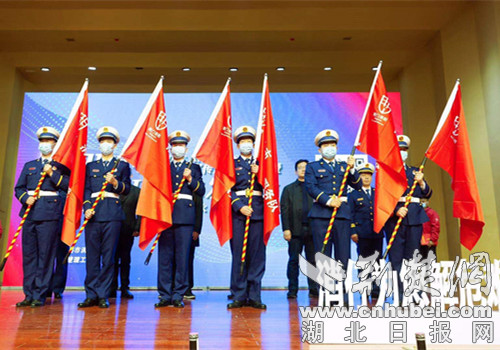 图为现场为荆门消防宣传服务队授旗。通讯员供图