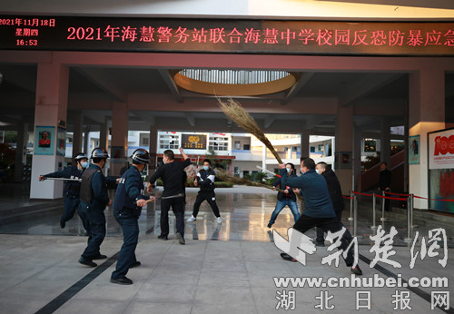 荆楚网(湖北日报网)讯(通讯员 贺林辉) 为把全警大练兵工作做深做实,突出“规范化、专业化、实战化”要求,针对难点重点问题和社会敏感性警情进行专项训练。11月18日下午,荆门市公安局海慧警务站联合海慧中学师生,进行了一次校园反恐防暴应急演练。此次演练共170余人参加,实验小学、红旗小学分管安全工作负责人带领学校安保人员到场观摩。